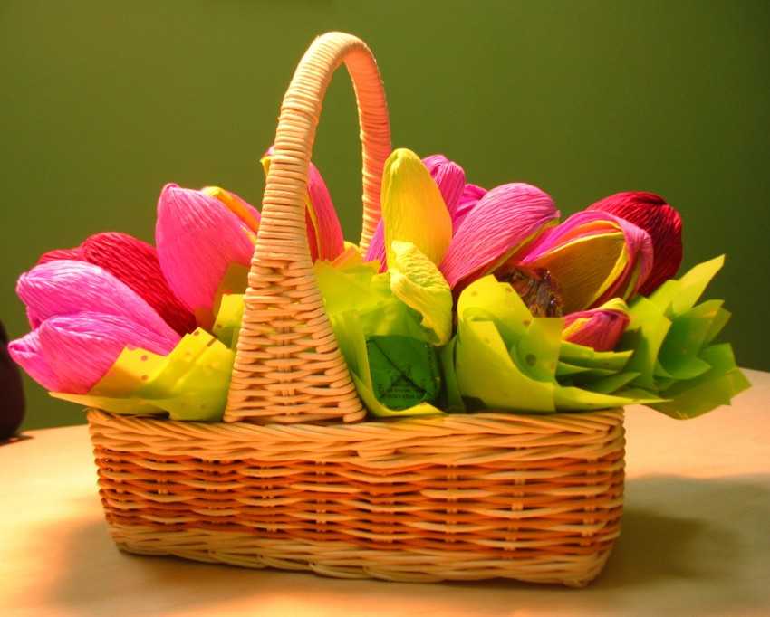 Чтобы подарок не казался простым, при возможности можно смастерить сладкий букет в корзинке или красивом горшочке.