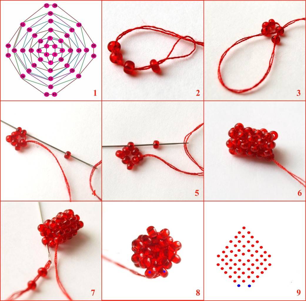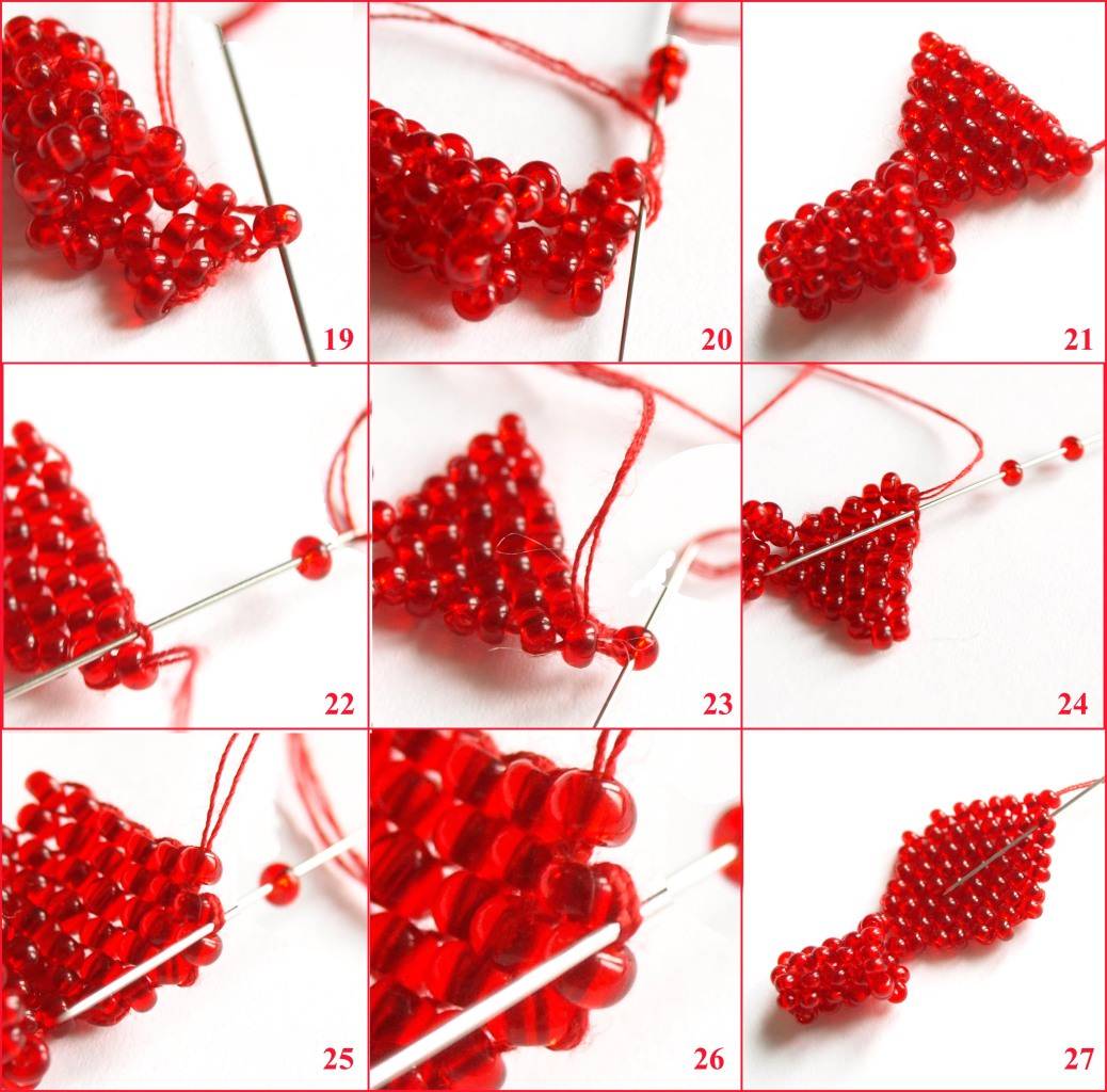 Начинаем плести небольшой жгутик при помощи техники мозаичного плетения. Для этого берём 4 бисеринки красного цвета и далее действуем по схеме.
