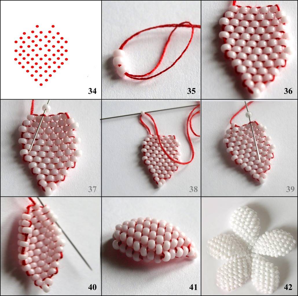 Белые внутренние лепестки плетутся аналогично красным, на пошаговом фото плетения фуксии из бисера хорошо видны все нюансы работы. После того, как все 5 белых лепестков будут готовы, их необходимо обработать так же, как и красные, чтобы придать объем, и собрать их вместе.