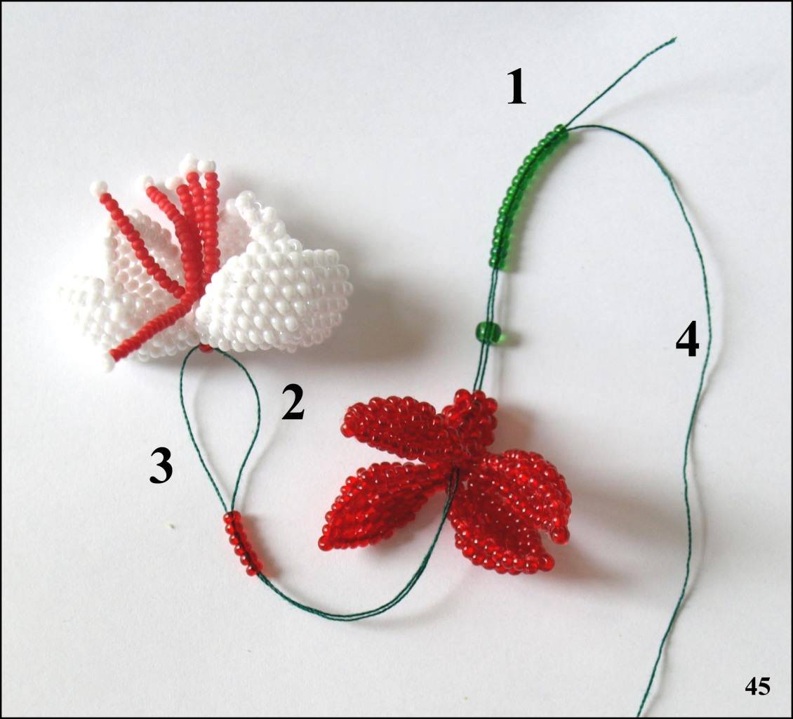 Затем через крупную белую бусину набираем на нитку или леску 18 красных и одну белую бисеринку – тычинки, их тоже должно быть пять, как показано на схеме. И собираем воедино весь цветок.