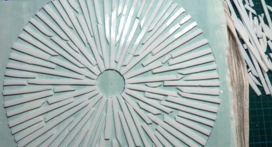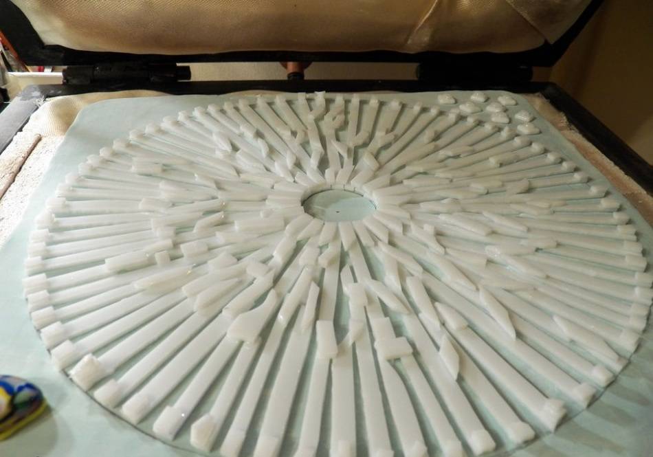 Предварительное скрепление выкладываемой композиции из стекла делается с помощью специального клея. Он крепит фрагменты к основе. Если композиция сложная и велика по ширине, прибегают к сэндвичу, накрывая флоатом еще и сверху.