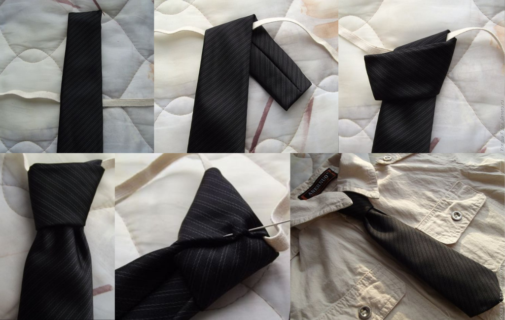 Взять тонкую резинку и пришить ее своими руками к верхней части галстука – узелку-трапеции.