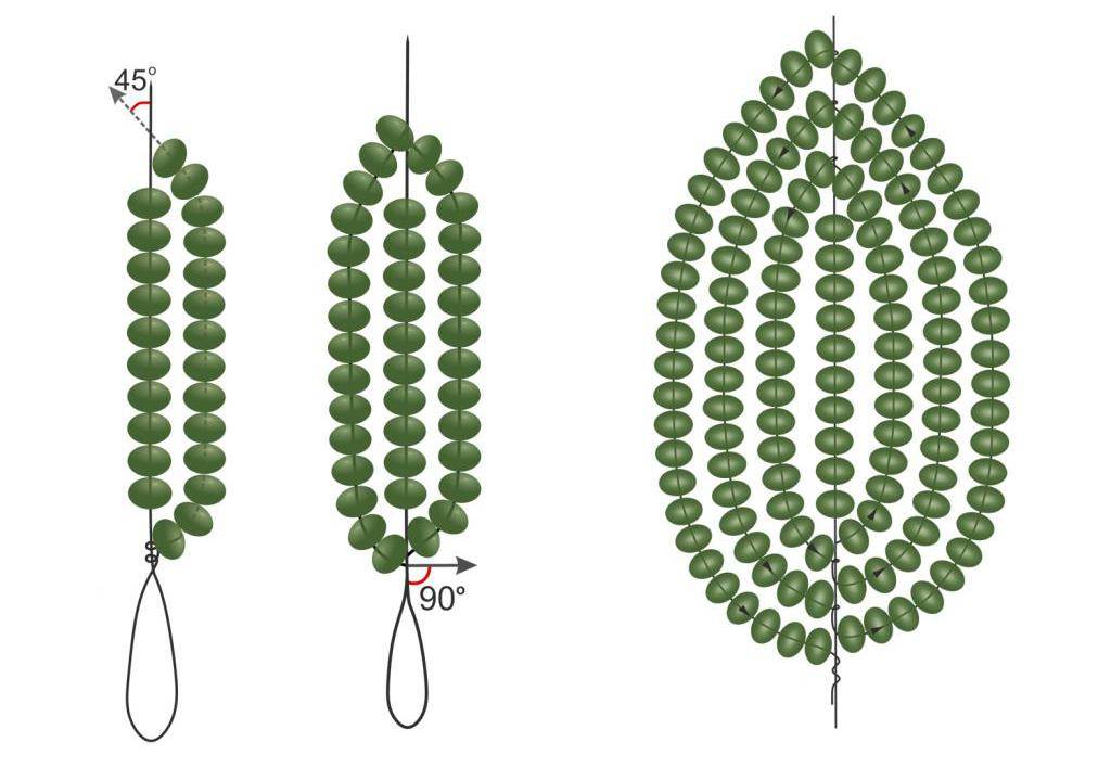 Освоить каждую из техник получится, если разобрать плетение бисером пошагово. Удобно пользоваться схемами, где стрелками показано, в каком направлении должна продвигаться нить по мере нанизывания на неё очередных бусинок.