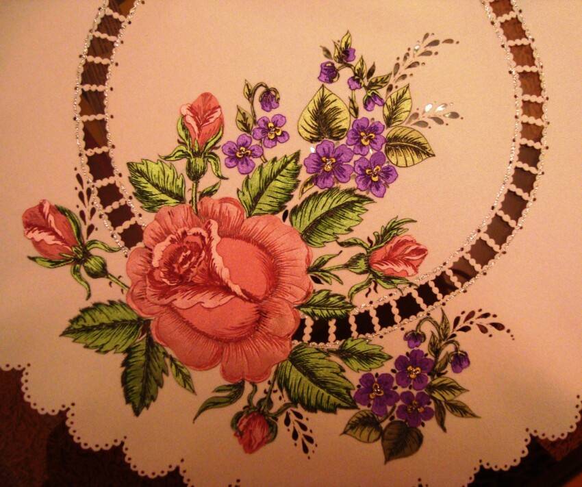 Кроме выжигательного прибора в работе можно применить и иглу. Если на готовой салфетке сделать вышивку, тогда результат порадует ещё больше. Ещё вырезанная вышивка наклеивается сверху ткани, пройденной выжигательным прибором.