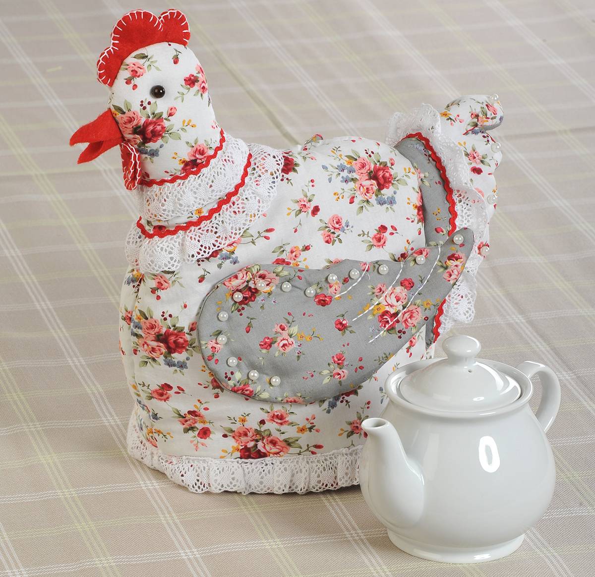 Сделать грелку можно в виде курочки. Сконструировать ее сложно, поскольку понадобиться сделать пару деталей. Отдельно будет выкроен и вышит птичий клюв с гребешком, крыльями, головой и телом. А потом должна быть собрана воедино вся курочка. Собственноручно опытная швея сделает шедевр. Хотя стоит создать более упрощенную версию, сделав выкройку с двухдетальной грелкой. Только тут нужно будет выстроить выкройку с круглым колпаком на чайник, не учитывая нос и ручку. Потом дополнительно построить детали для ручки и носа, куда будет помещен заварник.
