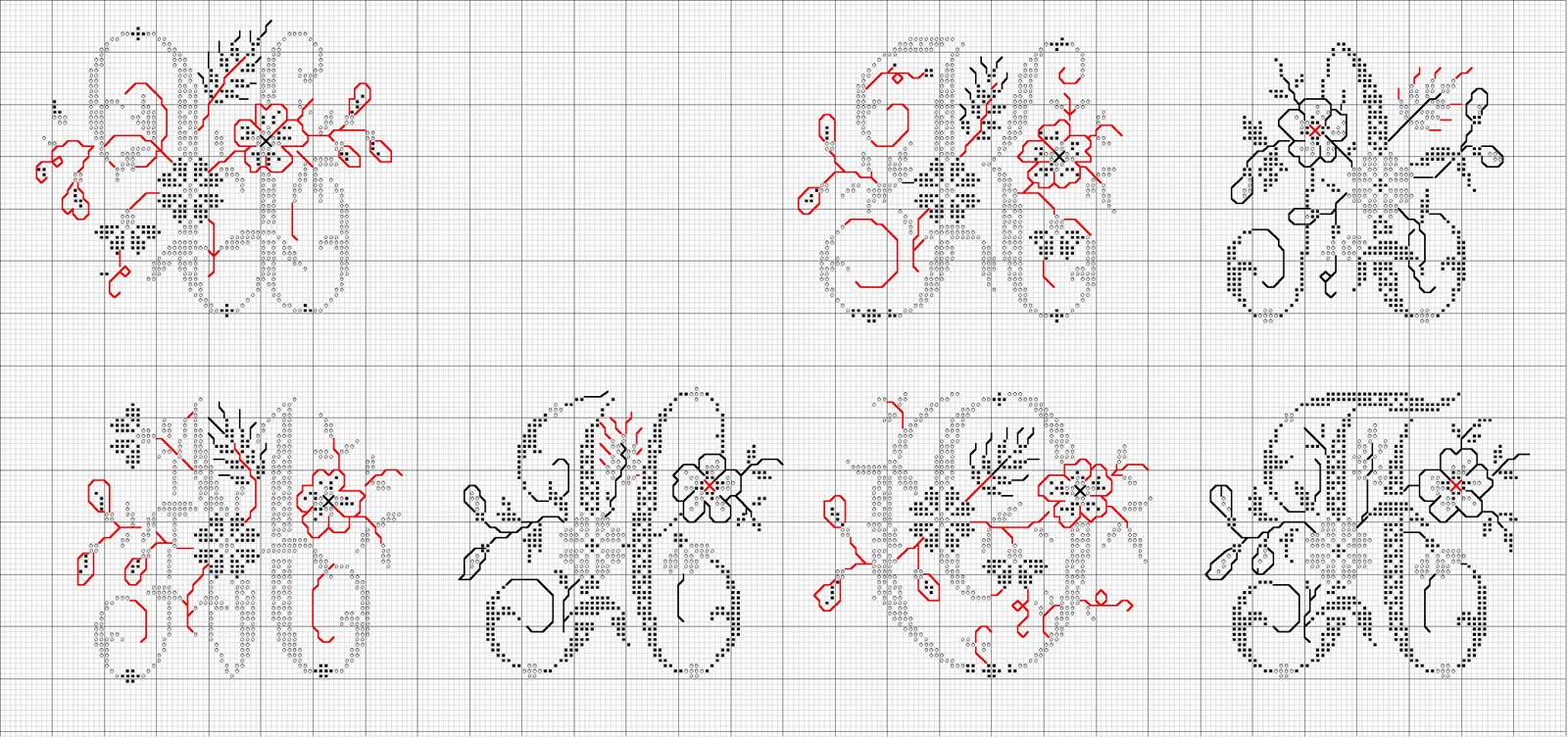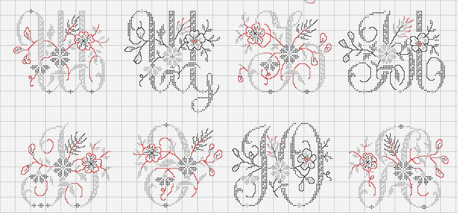 Каждая буква в этом алфавите имеет размер шестьдесят на шестьдесят крестиков. Веточки и контуры цветов, окружающих буквы выполняются при помощи шва «назад иголку». Здесь используется всего три цвета с чередованием: красный, черный и белый.