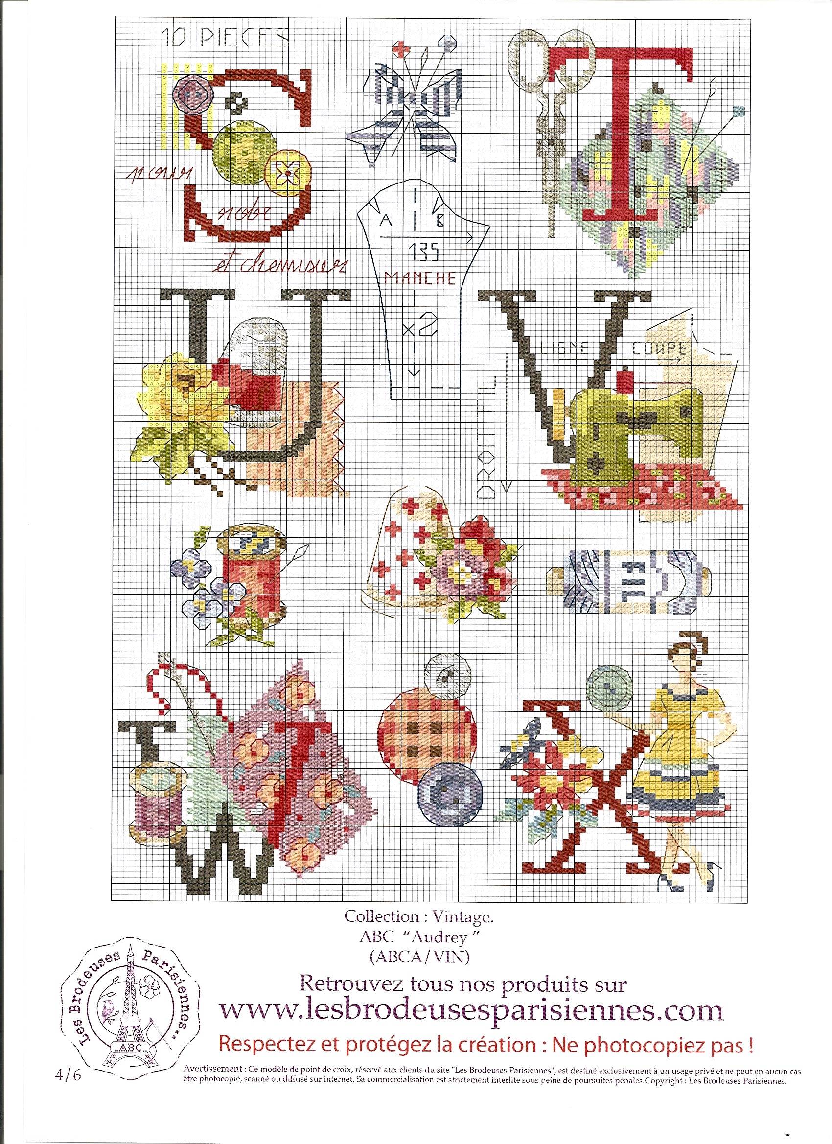 Алфавит с рукодельными вещичками в качестве оформления наверняка украсит халат любой мастерицы. На приведенной схеме имеются как буквы, так и просто небольшие элементы, которыми можно дополнительно украсить подпись. Каждая буква схемы занимает квадрат со стороной в двадцать пять клеточек. В данной работе используется почти тридцать цветов хлопковых нитей фирмы DМС. Основная вышивка, согласно схемы, производится крестом. Но помимо него используется также бекстич и французские узелки.