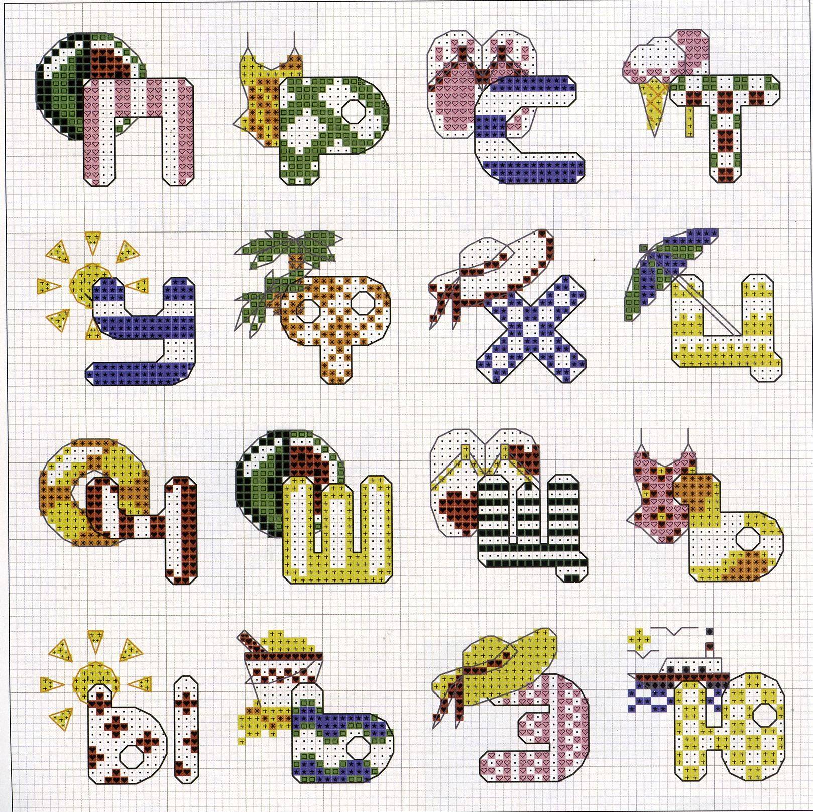 Как вариант, веселые разноцветные буквы на летнюю тематику. Данный алфавит выполняется крестиком. Для более четких границ используется шов «назад иголку». В данной работе задействовано около десяти цветов. Нитки хлопковые.
