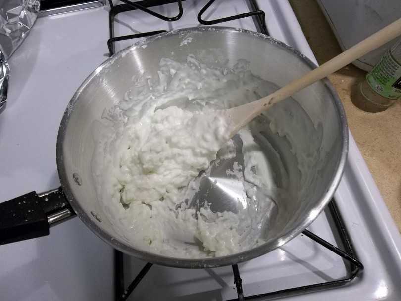 Перемешивайте раствор деревянной лопаточкой до того момента, пока густеющая смесь не будет отставать от стенок посуды, постепенно превращаясь в плотную массу.