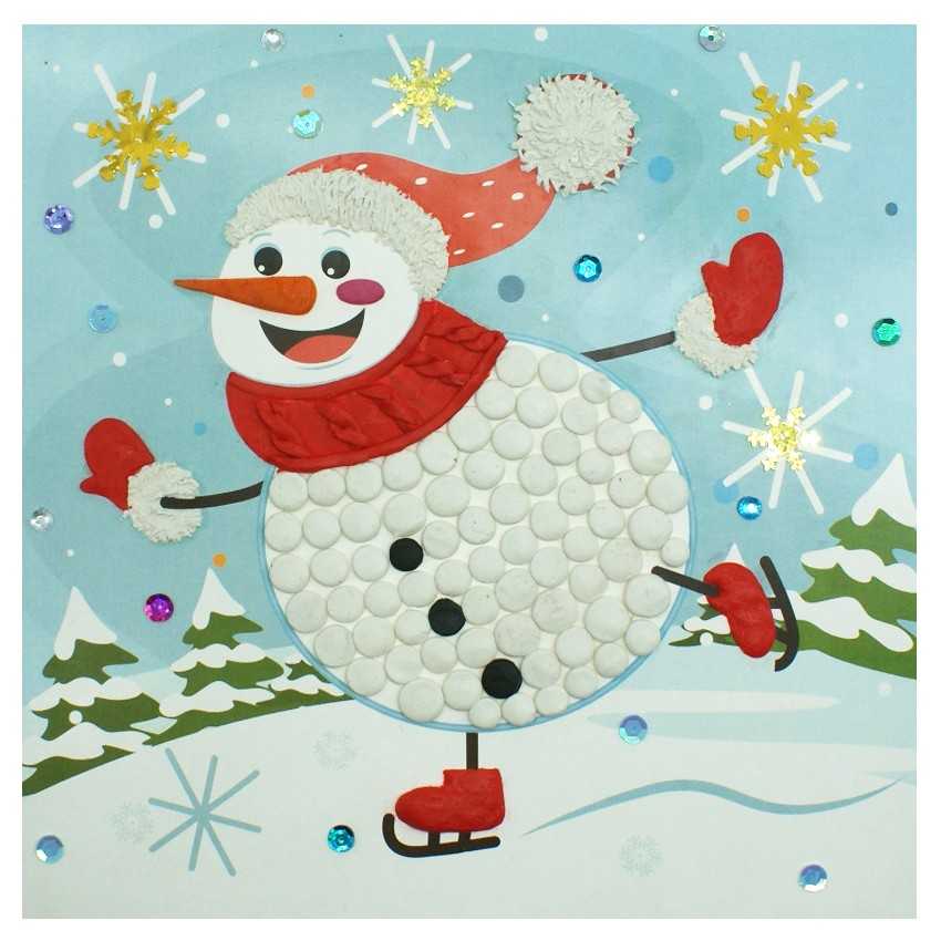 В этом случае для изготовления праздничного сюрприза вам понадобится плотная основа, цветная бумага для контрастного фона и кружочки из белой бумаги разного размера. Вырежьте кружочки и отложите их в сторону. На основу наклейте более темный фон, дождитесь пока клей высохнет. Приклейте кружочки один на другой, от самого большого до самого маленького. Задекорируйте открытку веточками, блестками, сделайте снеговику глаза, ноги.