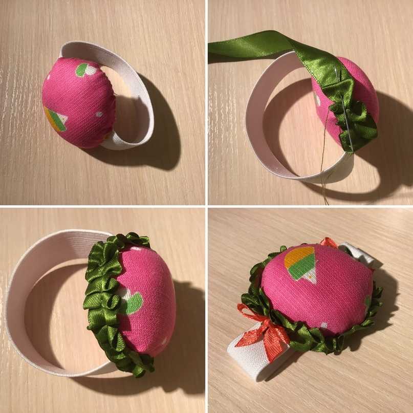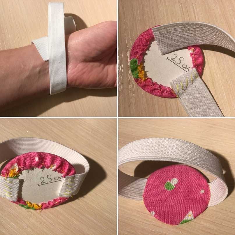 Сложите тканевый прямоугольник пополам по длине лицевой стороной внутрь, сшейте две длинные стороны, переверните лицевую сторону. Расправьте браслет и разгладьте его горячим утюгом. В центре тканевой ленты пришейте кружок из фетра диаметром 5 см. Пришейте резинку сначала к одной короткой стороне ремешка, затем к другой.