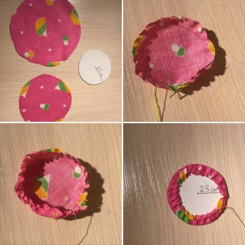 На тканевом круге прокладываем строчку обычными наметочными стежками на расстоянии 0.5 см от края. Стежки нужно делать небольшие, чтобы складочки получились не грубые и легли ровно.