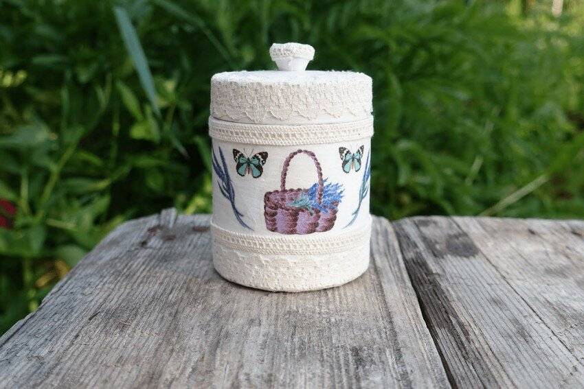 ![]() | Приклеить тряпочку при помощи клеевого пистолета, делая складочки. Сверху приклеить кружево. |