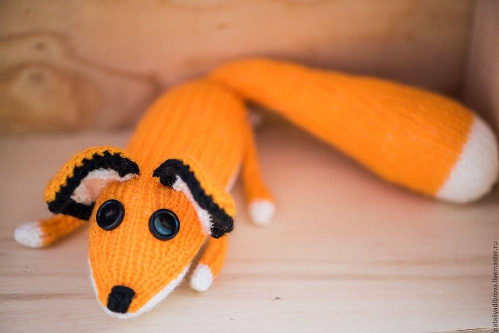 Вяжем хвост произвольной формы с белым кончиком. Можно сделать его прямым или слегка расширяющимся на конце. Для этого, начиная с середины полотна, делаем несколько симметричным прибавок в каждом втором ряду, а затем убавляем число петель на спицах. Лапки лучше всего сделать тоненькими, замкнув в кольцо 10-12 петель. Их кончики следует связать из белой пряжи. Лапки набивать не нужно, пусть они свободно свисают. Крючком или спицами вяжем треугольные ушки и обвязываем их края одним рядом столбиков без накида коричневой или черной пряжей крючком. Сшиваем все детали, вышиваем носик черными нитками, пришиваем глазки-пуговки. Лис спицами готов!