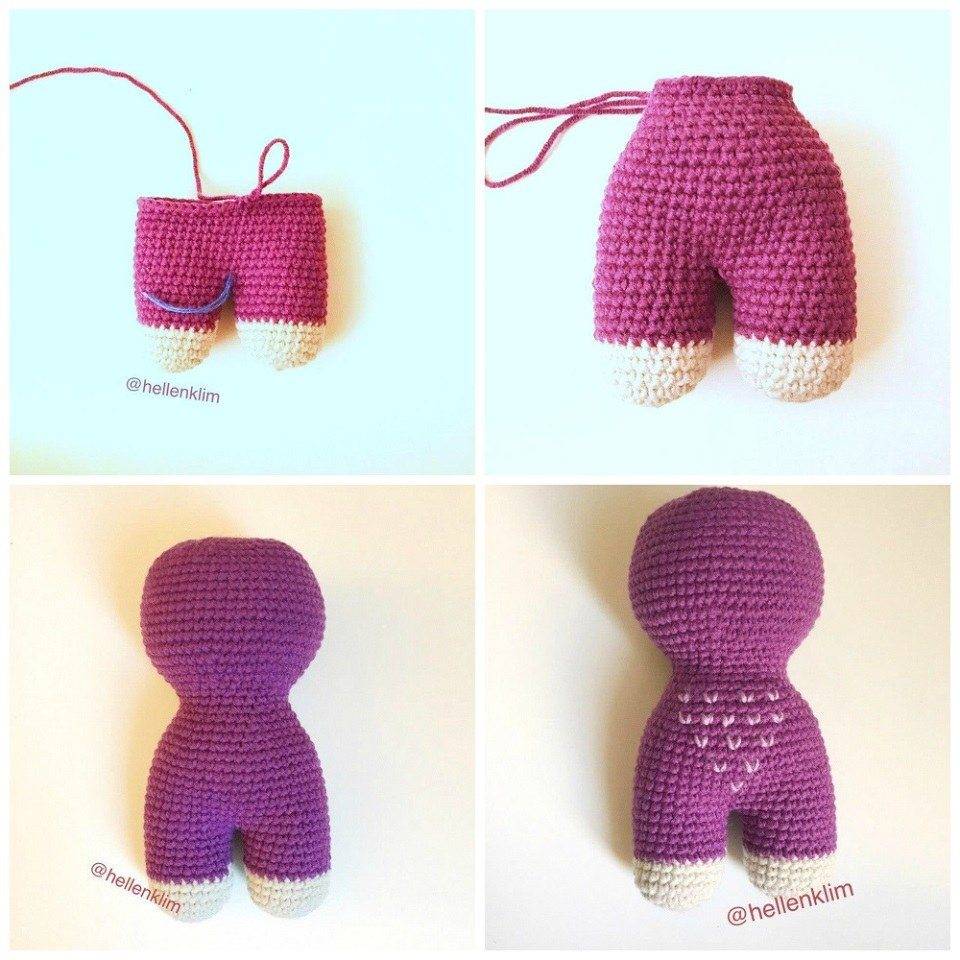 Меняем цвет пряжи на фиолетовый: 8-12ряд: 24сбн (24) На левой ноге нить обрезать и закрепить. На правой — нить не обрезаем, а продолжаем вязать тело.