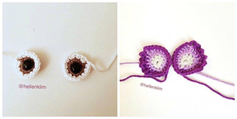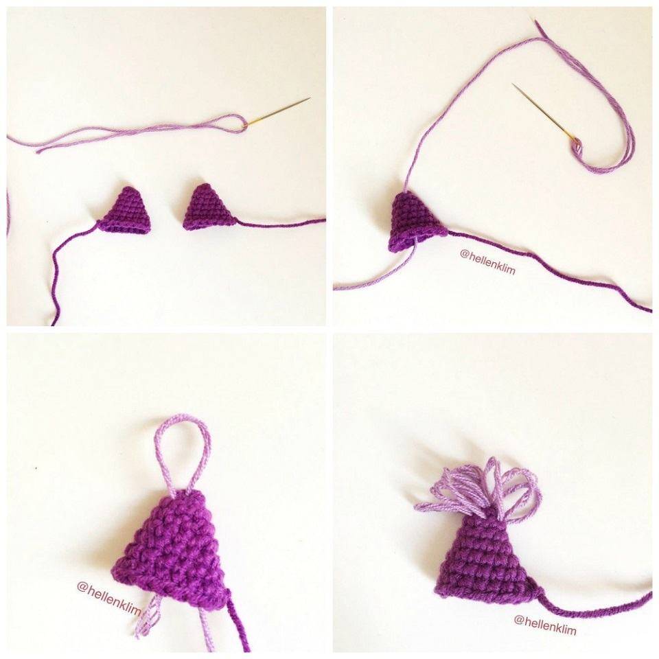 Ушки (2 детали) Вяжем фиолетовой пряжей: 1ряд: 6сбн в к.а. (6) 2ряд: (2сбн, пр)х 2 раза (8) 3ряд: (3сбн, пр)х 2 раза (10) 4ряд: (4сбн, пр)х 2 раза (12) 5ряд: (5сбн, пр)х 2 раза (14) 6ряд: (6сбн. Пр)х 2 раза (16) 7ряд: 16сбн (16) Нить закрепляем, отрезаем, оставив длинный конец нити для пришивания детали.