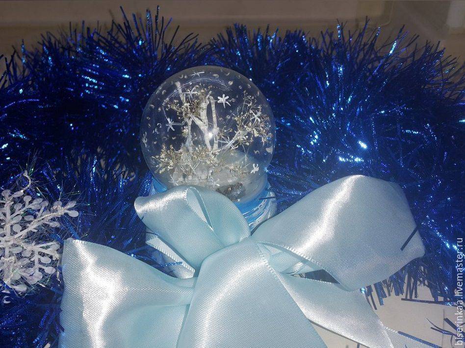 Для начала подготовим внутренний декоративный элемент из проволоки, это может абстрактная вытянутая фигурка, очертания цветка или веточки дерева. Сделать поделку именной можно, если скрутить из проволочки имя или первую букву имени одариваемого. После чего закрепляем деталь на пластиковой или пробковой крышечке. В лампочку заливаем воду с глицерином в пропорции 7:3. Засыпаем туда блестки. После этого закрываем лампочку крышкой с декоративным элементом, заливаем все тщательно термоклеем и затягиваем цоколем. Заключительным этапом будет закрепить поделку на подставке цоколем вниз и задекорировать место скрепления красивой лентой. Магический снежный шар готов!