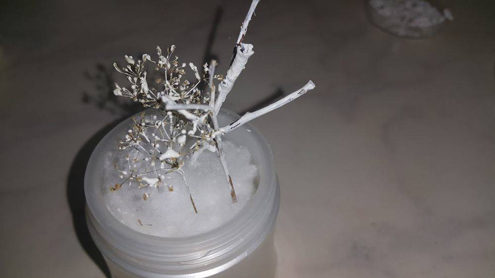 - Пока эффект снега на веточках подсыхает, баночку нужно наполнить ватой.