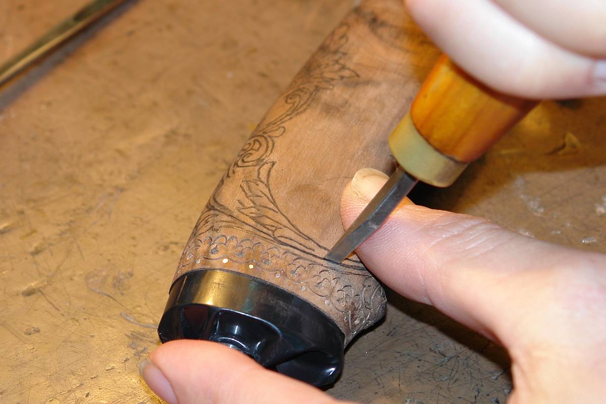 - Металл. Как основа, например, для оружия – это сталь. Для создания орнаментов на дереве применяют листовую медь, олово, латунь, алюминий, бронзу, серебро, золото. Они удобны в изготовлении и дают красивое сочетание с древесным тоном.