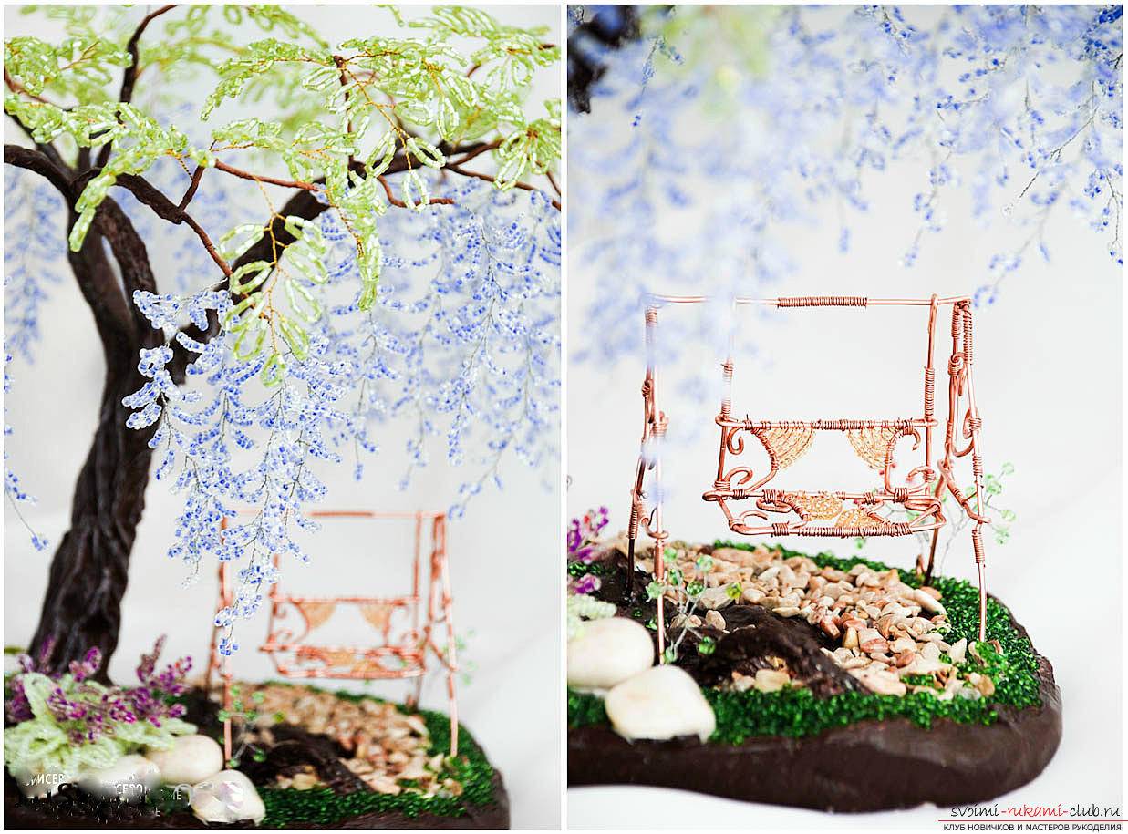 Чтобы декорировать ствол, подготовьте аналогичную смесь и обмажьте его. Внизу ствола нужно сделать утолщение – так он будет выглядеть более естественно. После высыхания раствора покрасьте ствол и ветви акриловой краской коричневого цвета и дайте краске высохнуть. Чтобы создать на стволе эффект рельефности, возьмите черную краску и начните наносить на него вертикальные лини, используйте жесткую кисть. Нижнюю часть с утолщением прокрасьте более насыщенно. Декорирование глицинии По желание можете найти инструкцию по изготовлению качели из проволоки. Приклейте к основе декор в виде цветов и других растений из бисера. Красиво будут выглядеть дорожки из гальки, песка и ракушек. Эти элементы крепятся с помощью ПВА (слой должен быть достаточно толстым). Если в качестве декора вы выбрали большие камешки, то их лучше крепить с помощью раствора из гипса и клея. Оригинально будет выглядеть и травка из бисера.