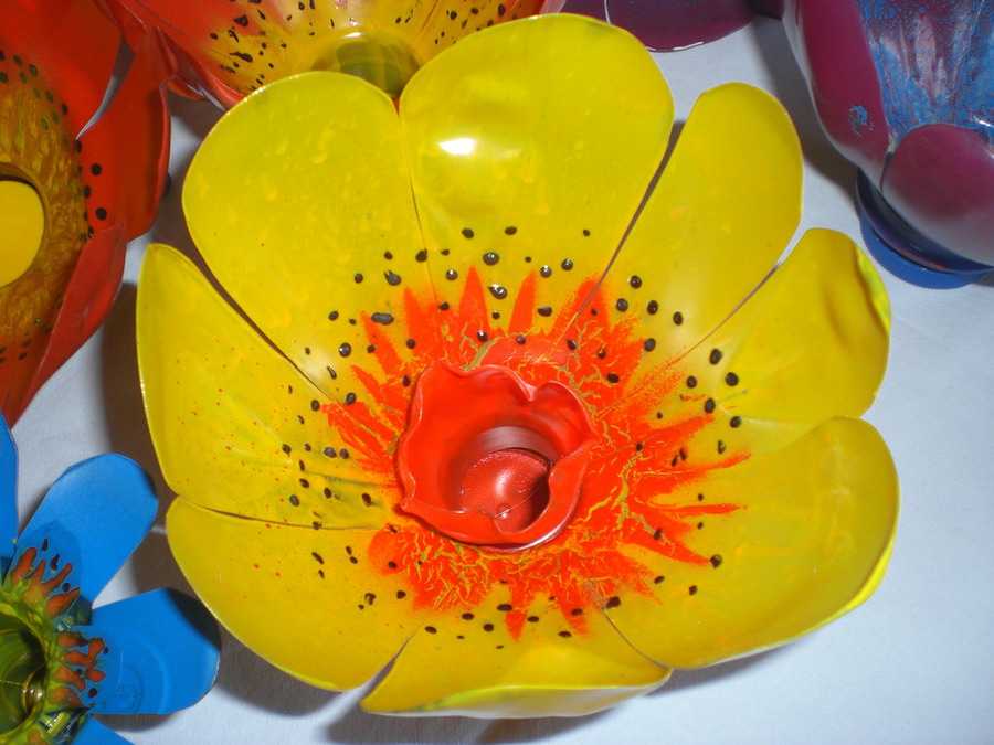 Для создания таких цветов используют часть возле горлышка. Ее разрезают, формируя лепестки. Дальше — чуть подогреть, придав нужный изгиб лепесткам, немного краски, сердцевина из оплавленного куска с резьбой (бутылка меньшего диаметра, пойдет и аптечная). Вот и получился лютик.
