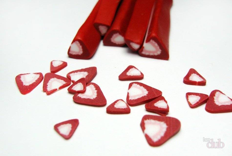 Возьмите полимерную глину белого цвета, разомните ее и сформируйте вытянутый треугольник. Далее возьмите розовую полимерную глину и сформируйте из нее пласт с толщиной примерно миллиметр. Теперь снова возьмите полимерную глину белого цвета и сформируйте из нее несколько тонких колбасок. Также сделайте несколько колбасок из глины красного цвета. Теперь вам необходимо соединить все эти колбаски между собой.