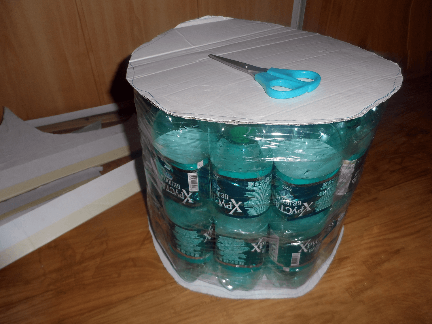 Когда каркас конструкции будет окончательно сформирован, для надежности еще раз обмотаем его скотчем. Перед дальнейшей работой проверьте Пуф на прочность. Положите на него картонку и сядьте, взяв в руки что-нибудь тяжелое. Если бутылки начнут сминаться, укрепите их, наполнив песком.