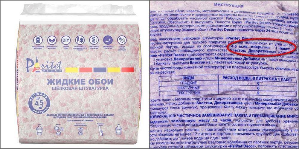 Производители обязательно указывают на упаковке, на какую площадь рассчитано содержание пакета жидких обоев.