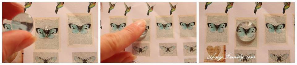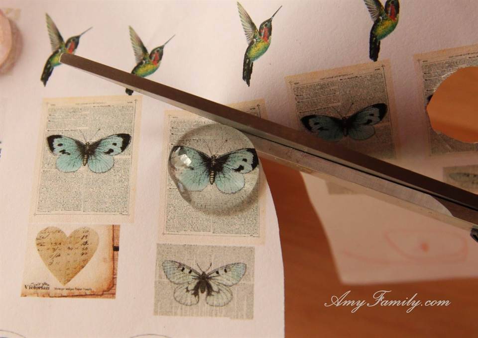Далее нужно приложить стеклянный кабошон к картинке с клеем и, аккуратно выдавливая пузырьки, разглаживаем кабошон по картинке.