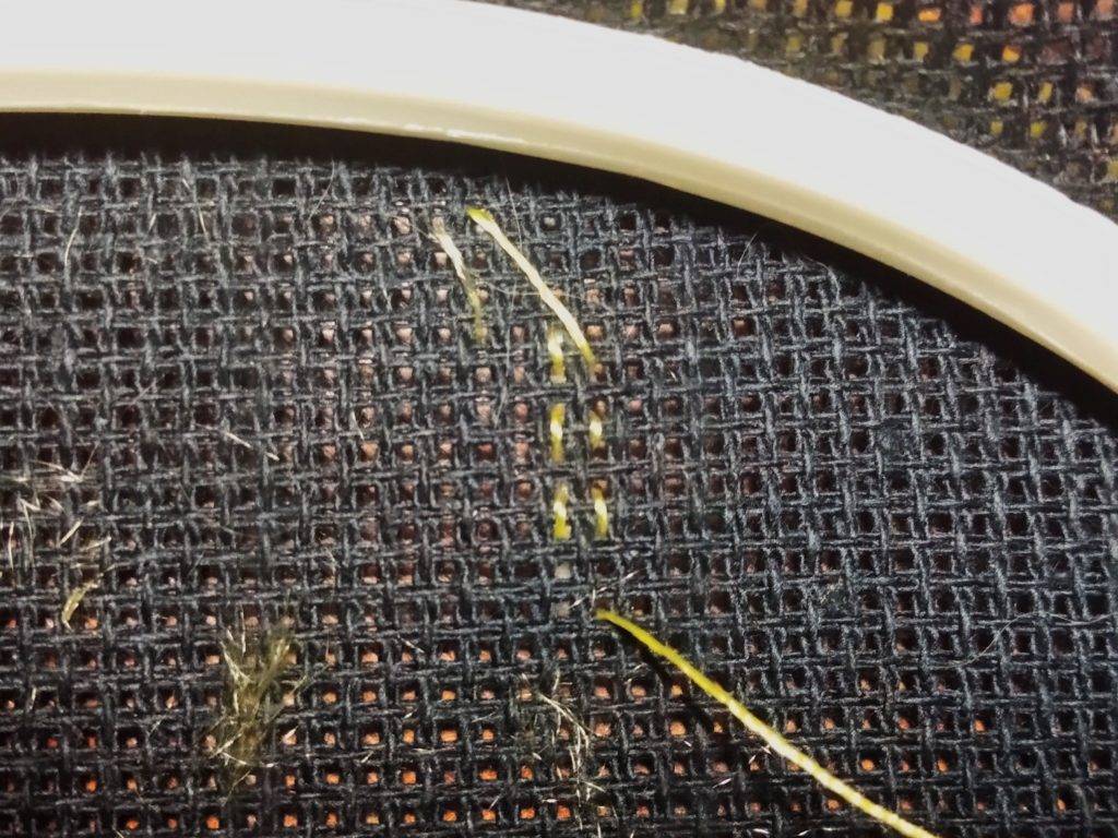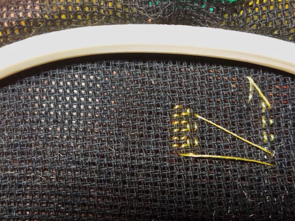 - Нить вдевается в иголку. На конце нити можно завязать узелок. Нить нужно зафиксировать в одном из углов полотна на изнаночной стороне, там, где будет начинаться схема. Нить можно прикрепить при помощи нескольких микростежков. В итоге нить должна выводится на лицевую сторону.