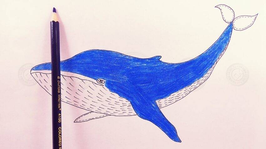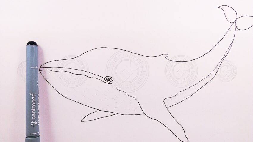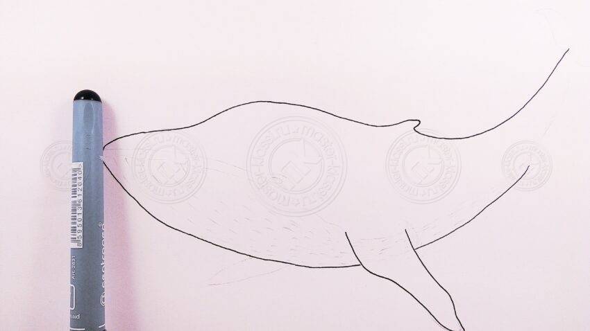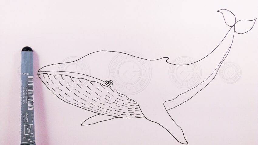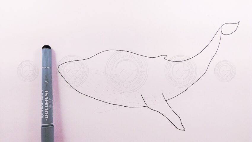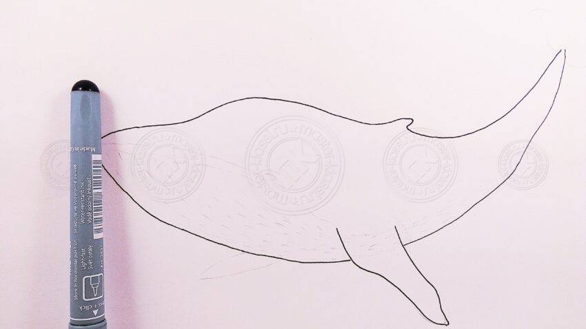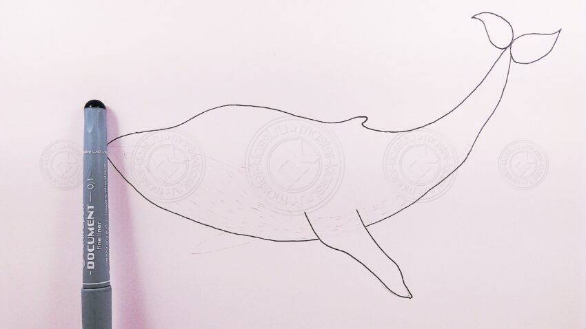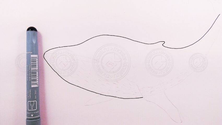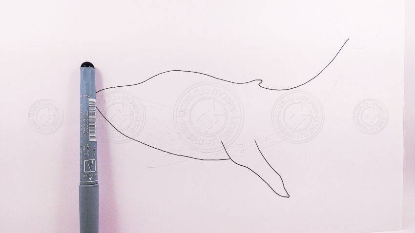 8. От плавника продолжите искомую линию, очерчивая брюхо кита, и приподнимайте штрих вверх, выводя хвост.