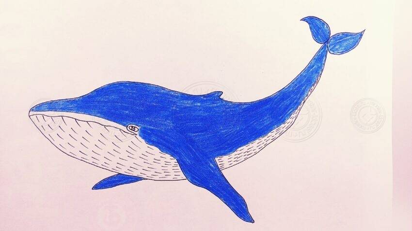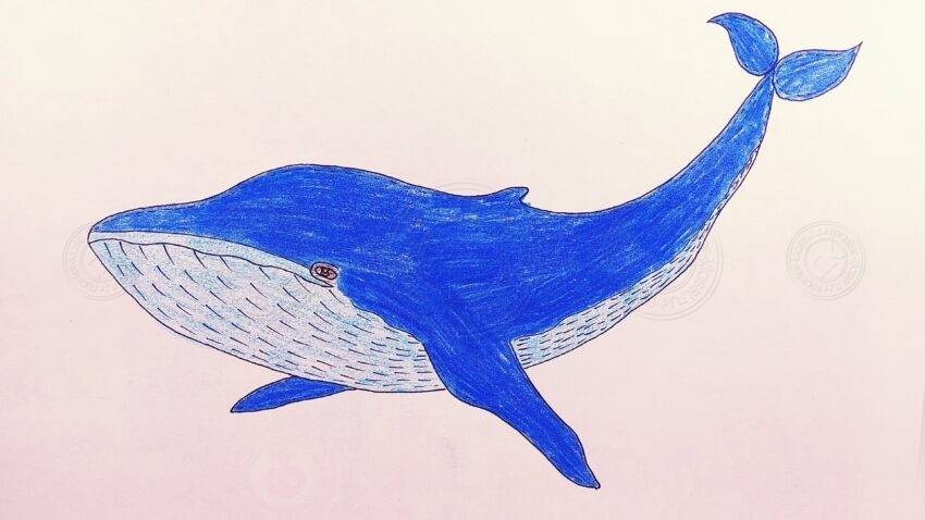 25. Голубым фломастером нарисуйте штрихи около кита, а также брызги, показывая, что он мчится по просторам океана. Вот и готов ваш яркий необычный рисунок морской тематики – красивый и крупный кит.