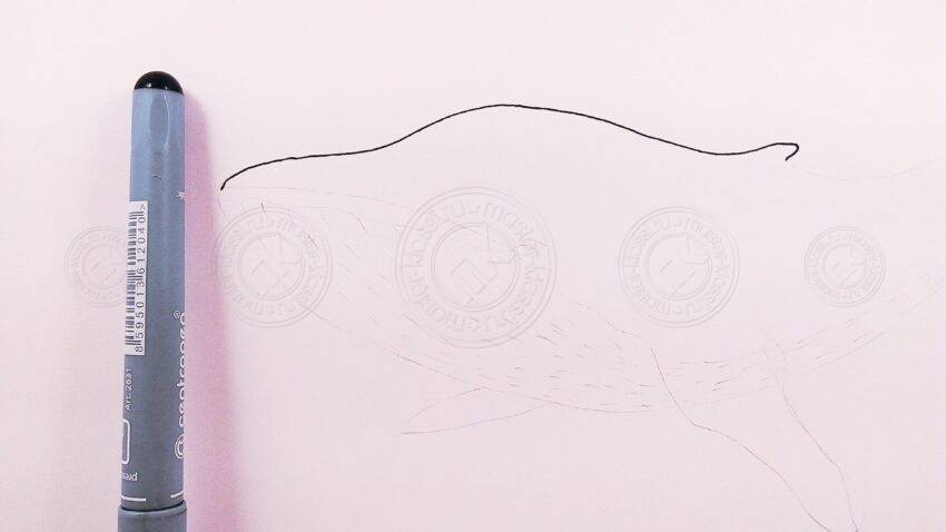 - Обведите контуром другой плавник. Затем нарисуйте хвост кита – это прямой контур эскиза.