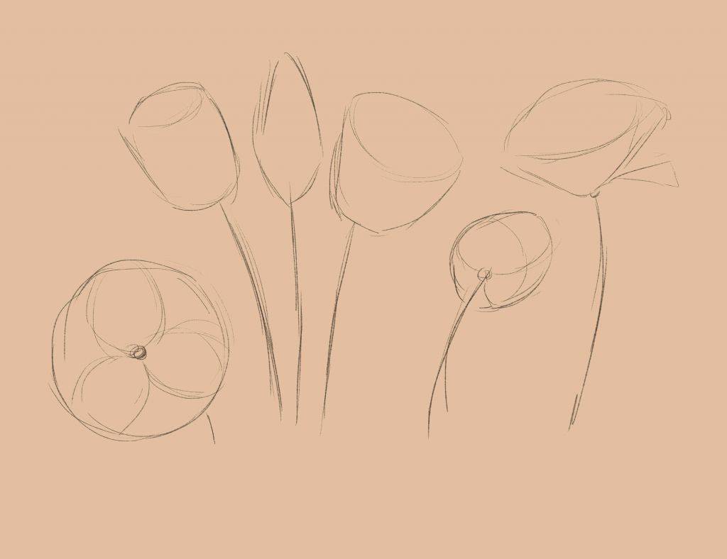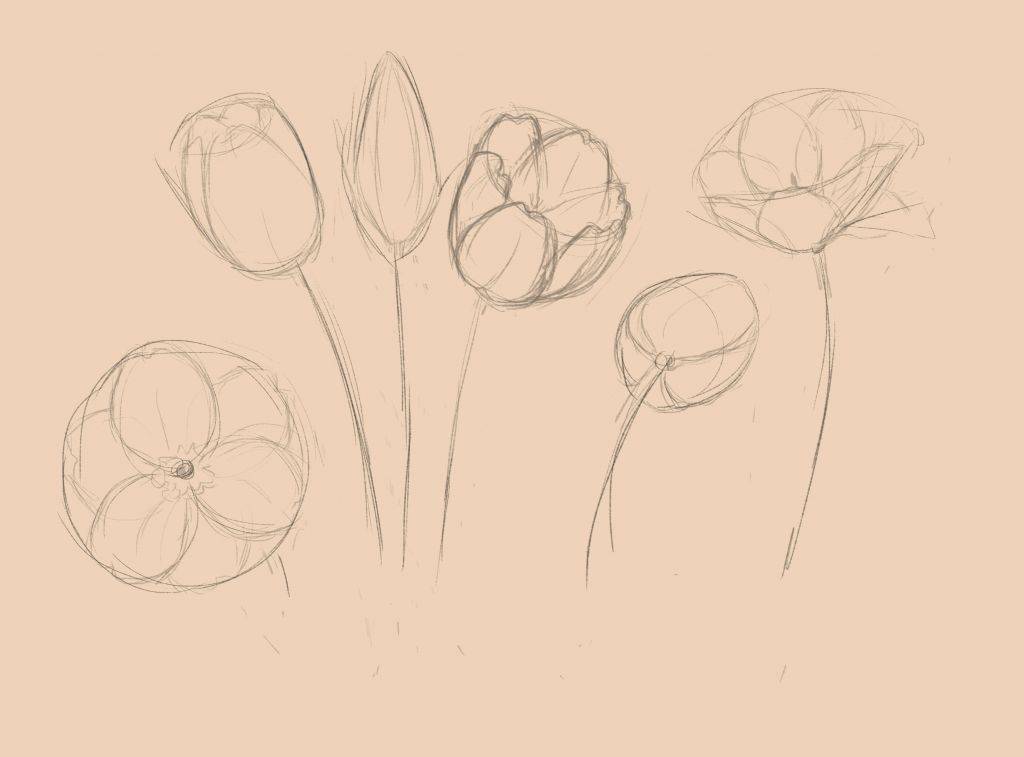 Наша задача понять как рисовать тюльпан в разных ракурсах и на разной стадии цветения.