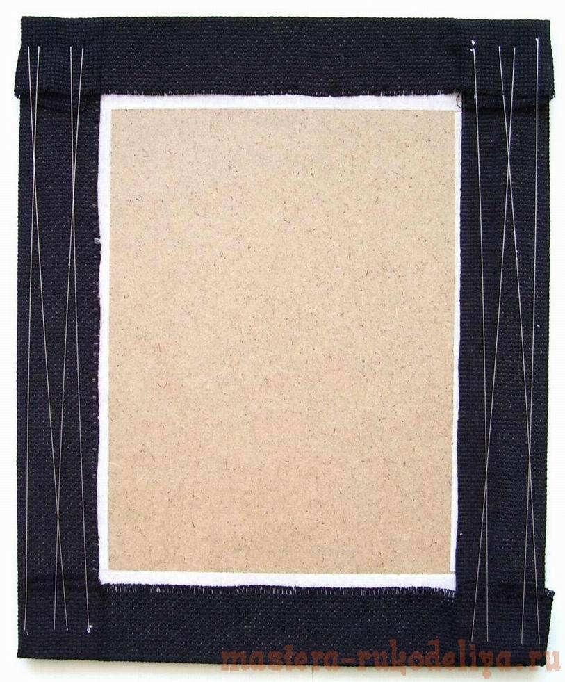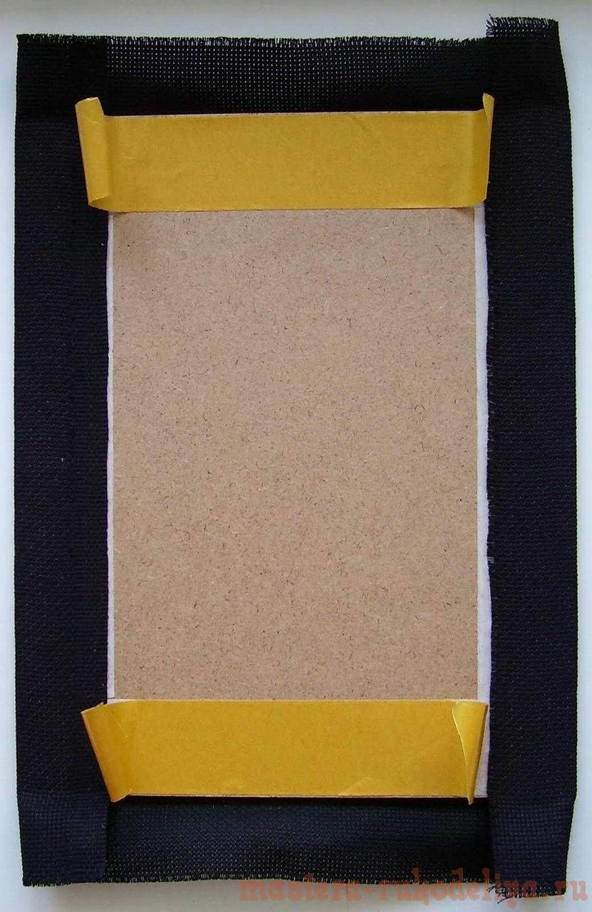 Затем края материи загните прямо на основу, и стяните противоположные стороны таким образом, чтоб полотно ровно было разложено на поверхности. После этого вам останется аккуратно разместить свою работу в самом обрамляющем изделии. На изнаночной стороне следует работу закрыть листом фанеры. Воспользуйтесь для этого небольшими гвоздиками.
