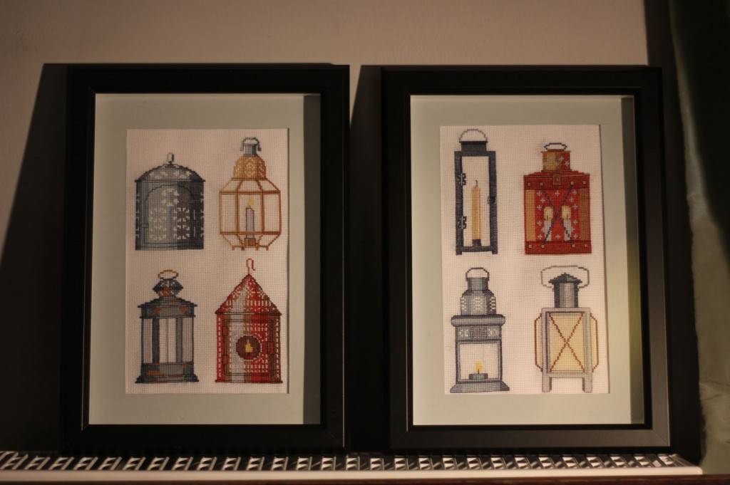 Как показала практика, такой способ – самый быстрый и надёжный. После того, как вышивка закреплена, остаётся собрать работу – вниз положить стекло и рамку, а саму вышивку на подложку и зажать эту конструкцию по бокам металлическими зажимами.