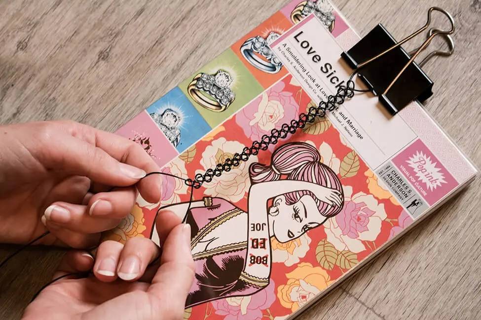 Окончание работ может иметь два варианта. Либо на концы плетения закрепляется застежка, либо украшение моделируется таким образом, чтобы его можно было одевать через голову. Кстати, эпоха девяностых именно неразрывными чокер-татушками и прославилась. Они и среди нынешних любителей чокеров ценятся, чтобы сделать чокер неразрывным нужно совсем немного.