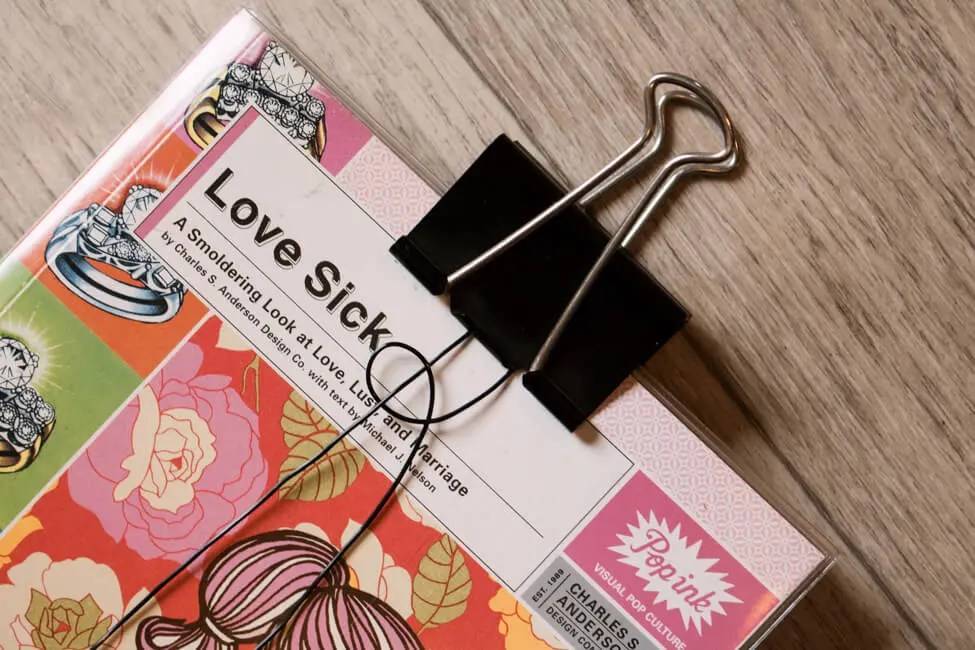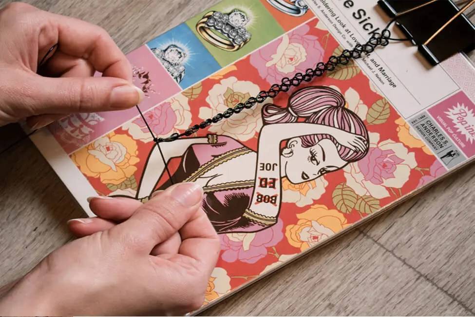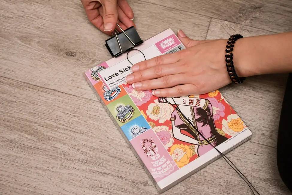 Для изготовления простого и стильного чокера, напоминающего тонкую татуировку, потребуется леска любой толщины, бисер и канцелярский зажим. Вместо лески многие мастерицы предпочитают использовать спандекс. Чтобы плести было удобнее, подготовим рабочую поверхность. Это может быть книга с плотной обложкой, блокнот или планшетка.