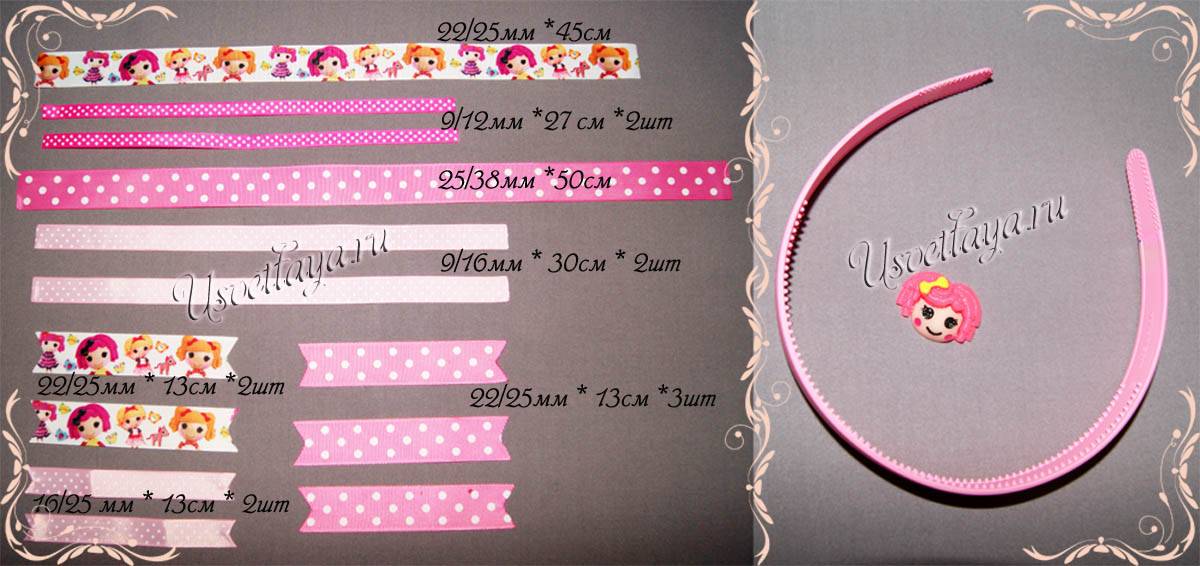 Отрезки по 23 см: розовая атласная лента шириной 5 см, белая атласная лента шириной 2,5 см, репсовая лента с пони.Короткие отрезки этих же лент по 11 см.Белая плотная перфорированная атласная лента имеет длину 26 см.