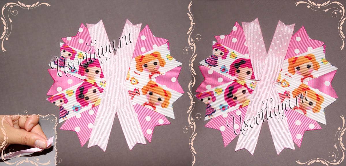 Прежде всего нужно опалить ленточки зажигалкой сразу после нарезки, чтобы в работе ленточки не осыпались. Для подложки берем ленты длиной 13 см, делаем срезы под углом и опаливаем их зажигалкой, при опаливании , лучше ленту держать так, как показано на фото в левом углу, так лучше опаливается серединка ленты и получается более заостренная. Ленты складываем в следующем порядке: крест на крест две широкие розовые ленты в горох и на них посередине такую же, между розовой лентой в промежутки накладываем ленту с изображением Лалалупси, тоже крест на крест, и в последнюю очередь узкую ленту в горошек, так как показано на фото, закалываем булавкой и откладываем в сторону.