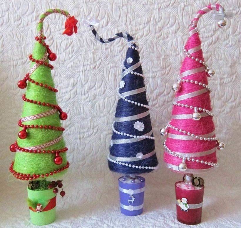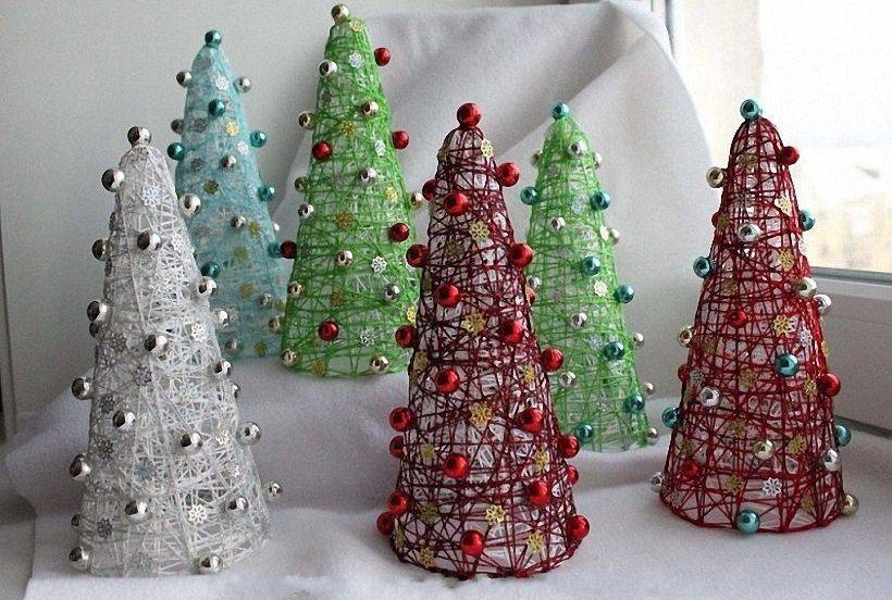 Для вдохновения посмотрите фото декоративных елок из ниток. Поделка может быть не только зеленой, но и красной, синей и даже разноцветной. Идей множество!