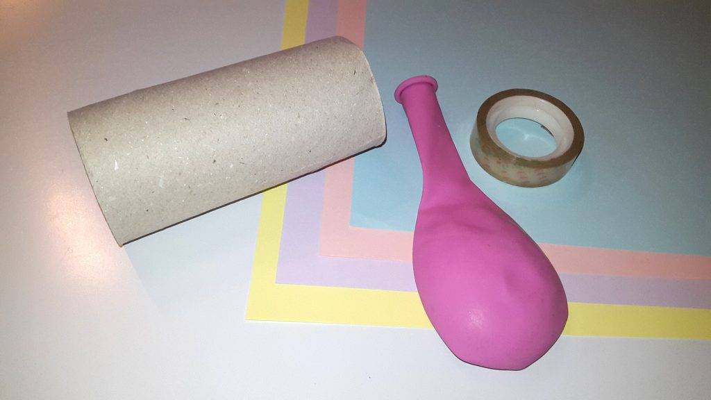 - Возьмите воздушный шарик и отрежьте нижнюю часть. С той стороны, где мы обычно его надуваем, завяжите плотный узел. Обрезанную сторону оденьте на втулку, которая будет являться патроном нашей будущей хлопушки.