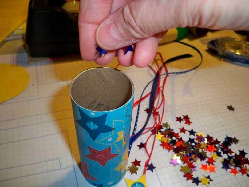- Наполните хлопушку содержимым. Это может быть конфетти, серпантин, блестки, дождик и т. д. В общем, все легкое, воздушное и разноцветное. Старайтесь утрамбовать содержимое как можно плотнее, можно с помощью пресса.