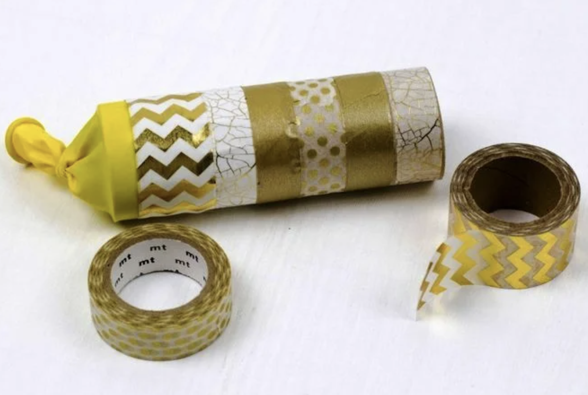 - Когда шарик надежно зафиксирован, приступаем к эстетической стороне вопроса, делаем оформление. Для этого можно использовать все, что есть под рукой: цветная или оберточная бумага, подарочные пакеты и так далее. Отмеряем на листе длину цилиндра и добавляем 1 см для загиба со свободной от шарика стороны. Приклеиваем при помощи скотча (клея, двустороннего скотча). После оформления откладываем хлопушку в сторону.