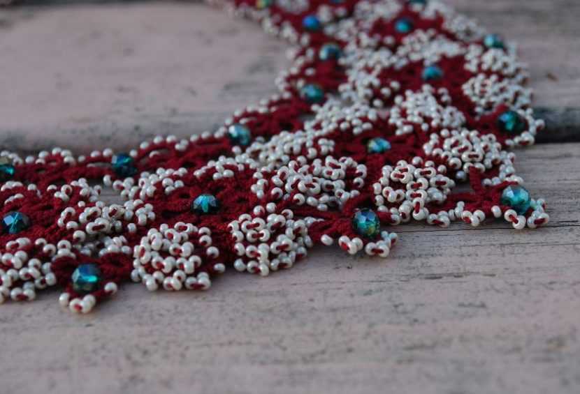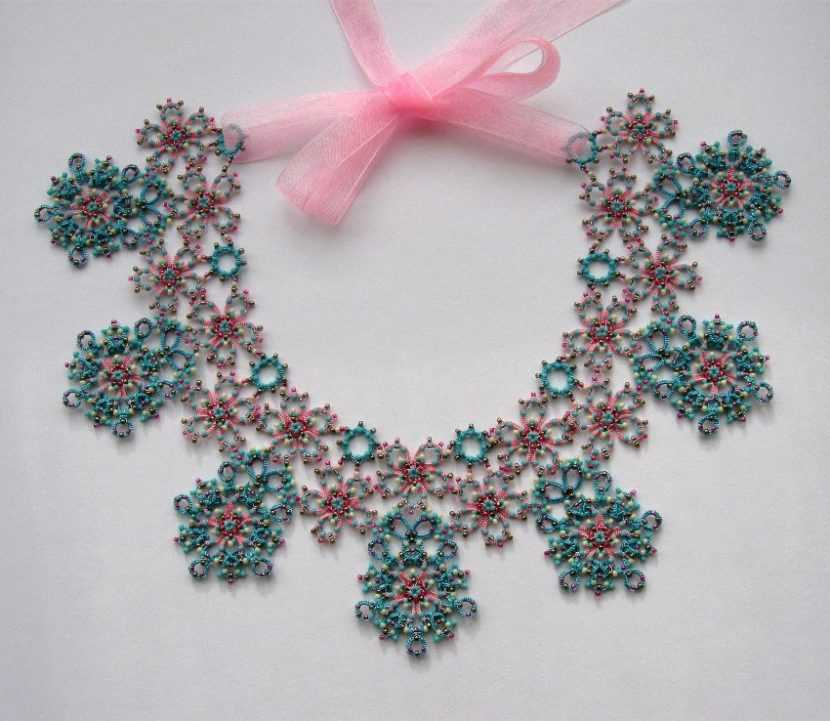 В среднем понадобится связать 13-15 элементов, после завершения работы колье можно зафиксировать простым английским замочком. Такое изысканное, но простое в исполнении, украшение можно дополнить бисером или бусинами. Колье станет идеальным штрихом для свадебного наряда.