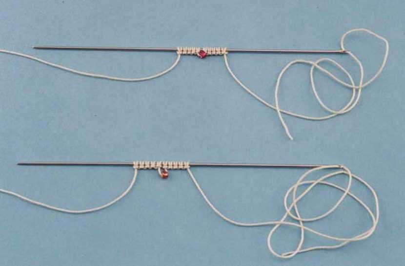 Работа с более крупными бусинами слегка отличается. Вместе с пико их вплетают редко. Самый изящный и чаще всего встречающийся вариант – бусинка в центре кольца. Для этого кольцо вяжут в два этапа. Первую половину провязывают как обычно, затем добавляют пико (оно должно быть чуть больше диаметра бусины), и после этого заканчивают вторую половину колечка. Бусину нанизывают с помощью крючка и перемещают на нить пико. Нить поддевают, используя дополнительную иголку. Иглу проводят через бусину, подцепив рабочую нить, затем вытягивают нитку из пико. Бусины с диаметром больше кольца тоже можно использовать, учитывая то, что они будут находиться с одной стороны плетения.