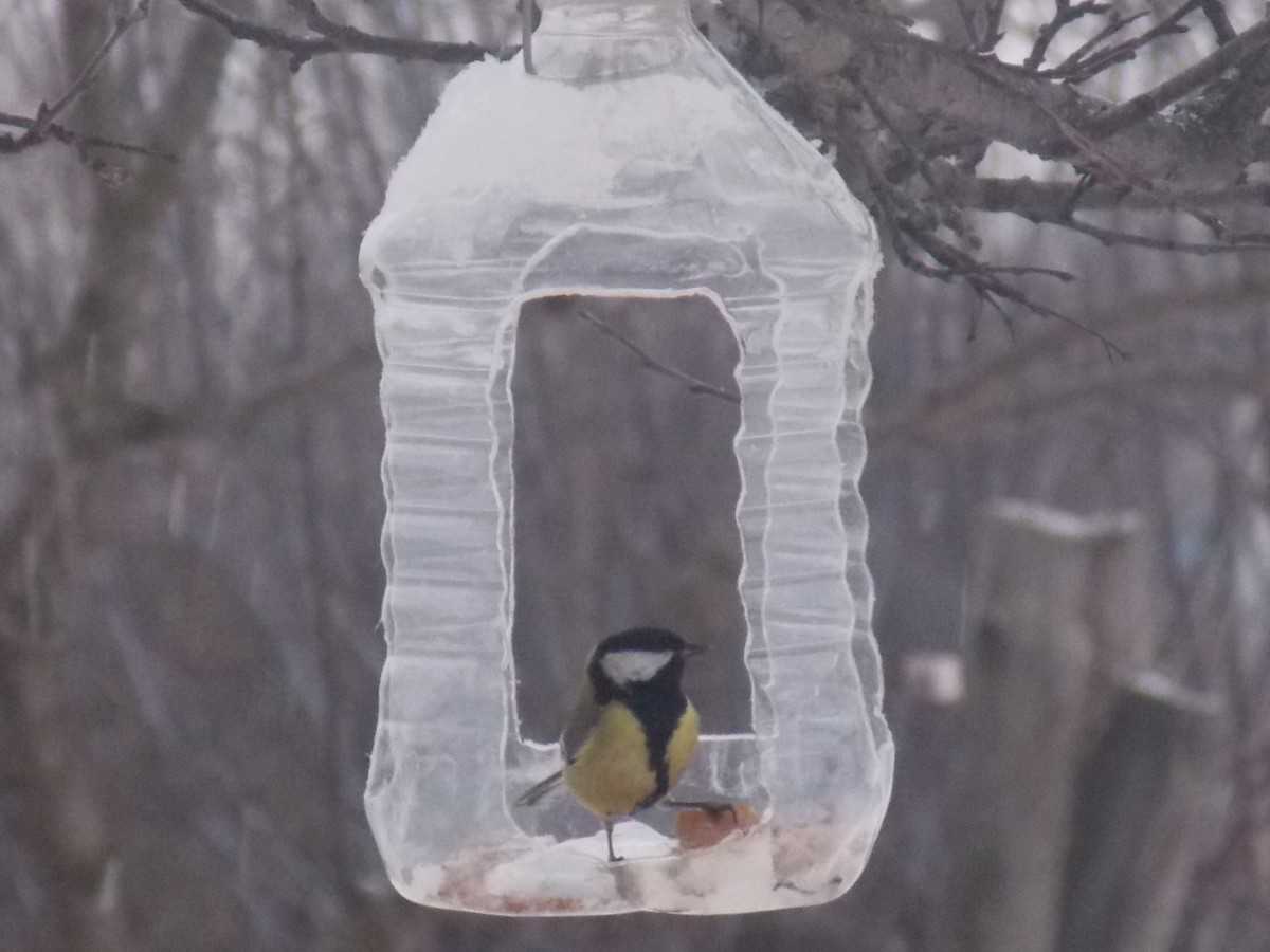 При изготовлении кормушек в ход можно пустить любую пищевую пластиковую тару. Отлично подходит бутылки на 1,5 или 2 л, а также баклажки на 5 или 6 л. Примеры таких кормушек приведены на фото ниже. Птичкины домики получаются аккуратными, влагостойкими и долговечными.