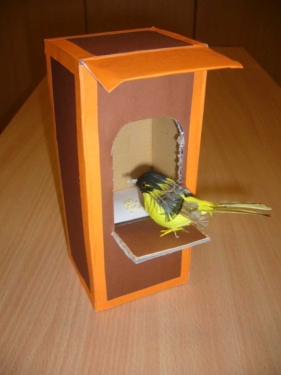 Как сделать кормушку из коробки? Картон — это недолговечный материал, а потому его надо защитить от действия влаги. В качестве гидроизоляции можно использовать скотч или полиэтиленовую пленку. Вариантов конструкции можно придумать множество: