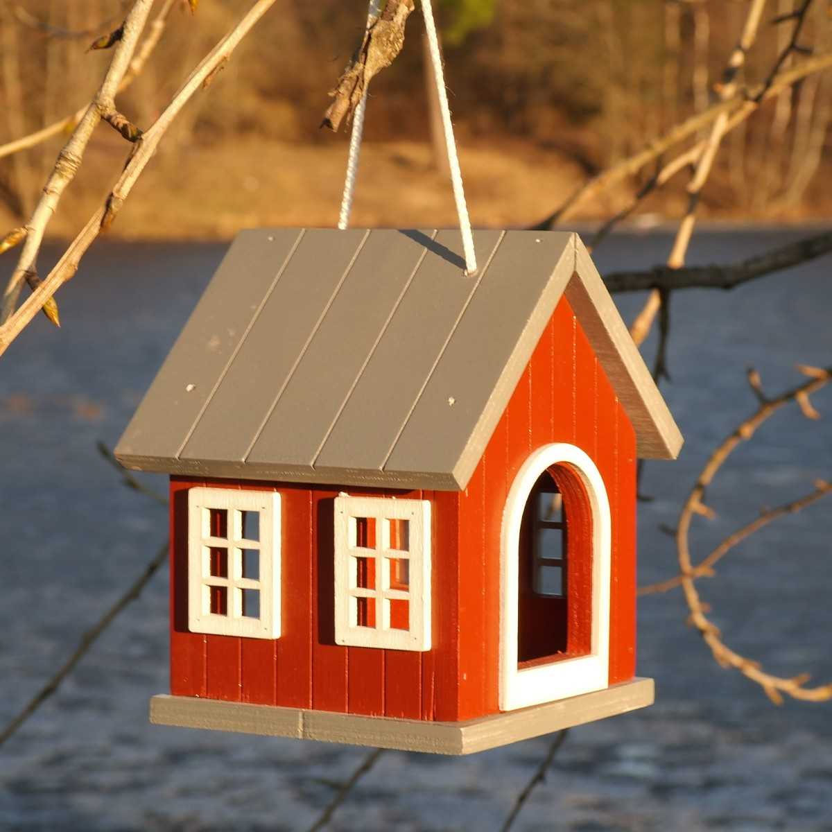 Вариант кормушкиСовет: домик предварительно можно обработать лаком или краской для защиты от влаги. Прежде чем повесить кормушку на дерево, выждите, пока все слои просохнут.