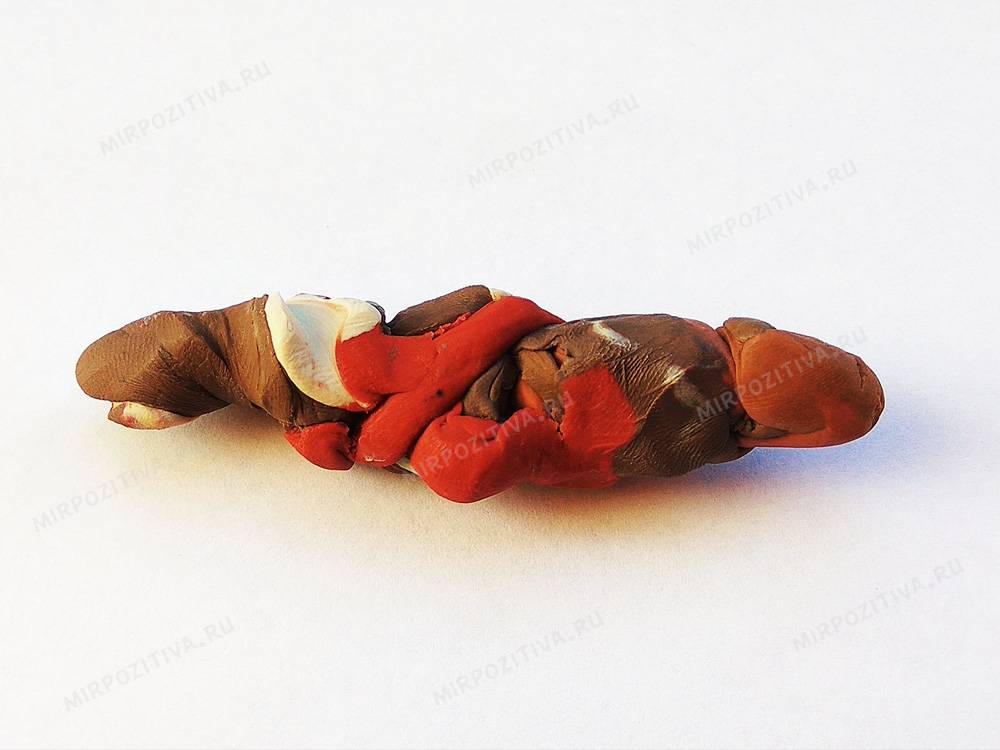 Чтобы вылепить ноги фигурки, обутые в необычные запоминающиеся сапоги, возьмите пластилин красного оттенка. Сделайте из него 2 заготовки длиной 3,5 см, внешне напоминающих стручки перца. Из коричневого пластилина сделайте плоские удлиненные лепешки – подошвы. Чтобы вылепить каблуки, задние края подошвы сверните рулончиком.